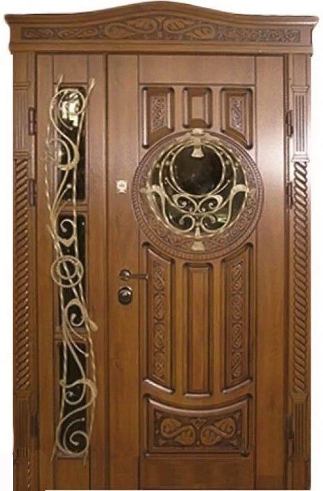 Поскольку в большинстве случаев устанавливаемые на входе в коттедж двустворчатые двери являются еще и предметом интерьера, украшающим здание, их дизайну предается особое значение. Эти двери, как правило, отделываются атмосферостойким МДФ, натуральным шпоном, массивом. Эффектно на таких дверях смотрится витражный узор, применение ковки, зеркальных элементов. Вариантов декора входной двустворчатой двери масса, тут все зависит от пожеланий заказчика.