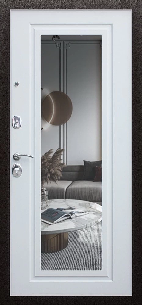 Надежная входная Дверь Комфорт с зеркалом премиум класса по цене 31 000 руб. Большая толщина стали защитит от проникновения в ваш дом, квартиру или коттедж. Используется очень качественная фурнитура: замки, цилиндры, ручки, защелки. Покрытие и отделка двери изготовлено под внимательным контролем производителя. Дверь имеет долгий срок службы и гарантию.